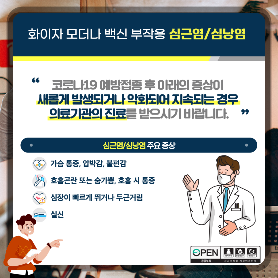 심근염과 심낭염이 발생할 확률은 희박하고 서둘러 진단과 치료를 받으면 대부분 낫는다고 하지만 증상이 심각한 사람의 경우에는 사망에 까지 이르기도 하기 때문에 의심 증상을 잘 알아둬야 할 것 같습니다.